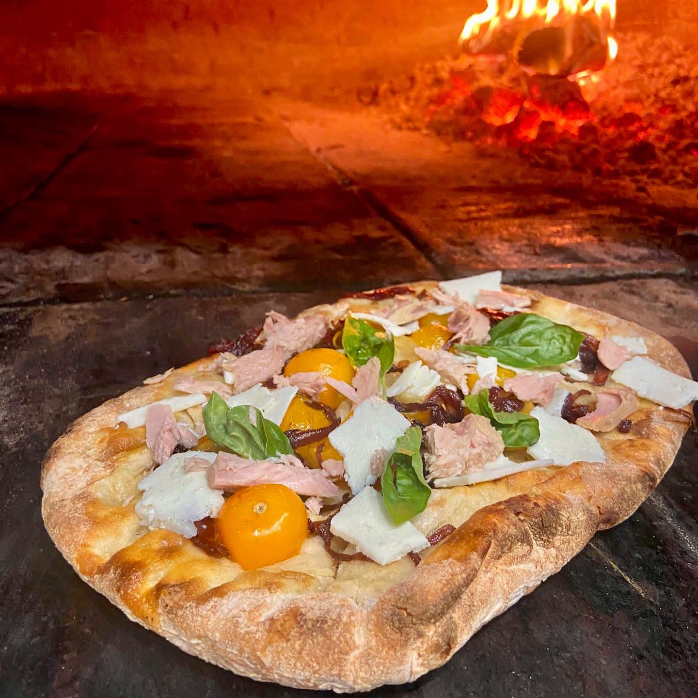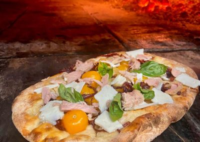 Pomodoro, Bocconcino Fior di Latte, Tonno, Cipolletta, Olive, Olio Evo, Origano, Basilico Km0