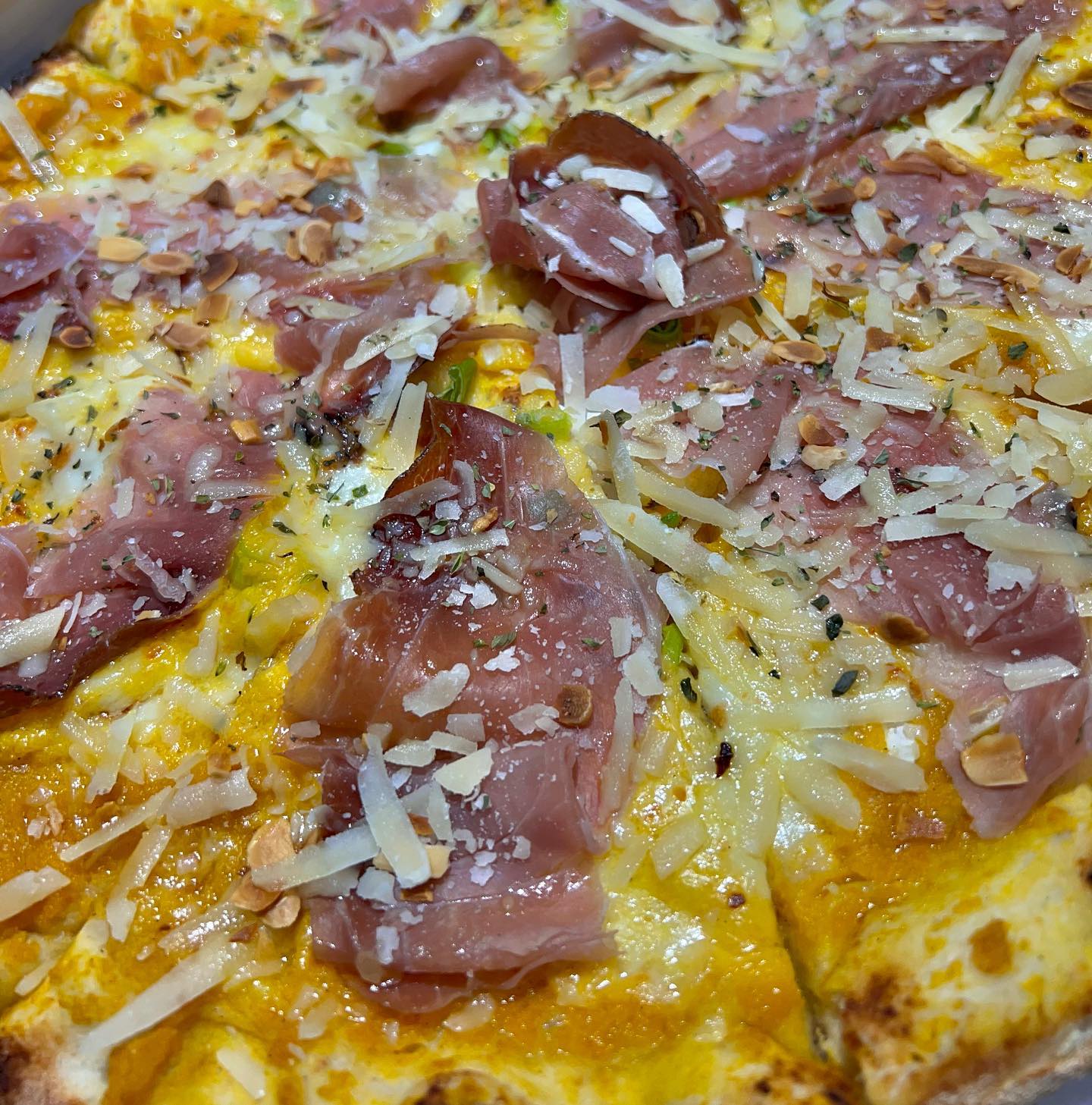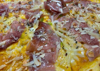 Crema di Zucca, Cipolletta Fresca, Bocconcino Fior di Latte, Speck, Scaglie di Grana, Scaglie di Mandorle tostate